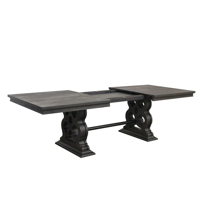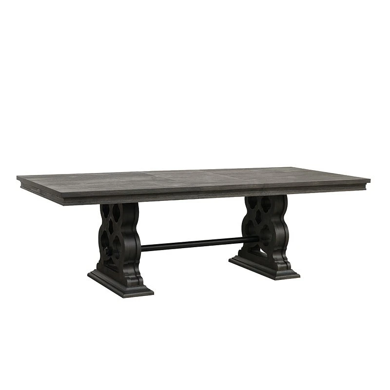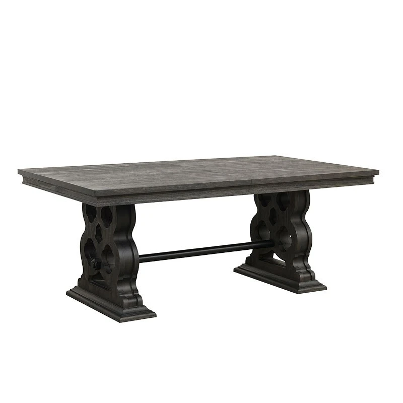 - OverviewBoldly designed, richly finished and beautifully accented, the unique aesthetic of the Arasina Dining Room Collection by Homelegance is for sure to draw your eye. The heavily appointed base supports of the table featuring a dark pewter-finished metal trestle that connects the two pedestals. Wire-brushed distressing provides texture to the acacia veneer of the table.