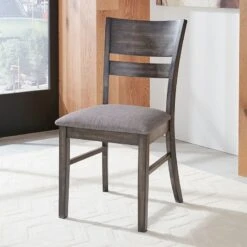 - OverviewBeautiful wood inlay details create a grand statement with elegance galore. The fabric upholstered chairs provide a stunning contrast against the rustic tone and finish for a look that is as cozy as it is chic.