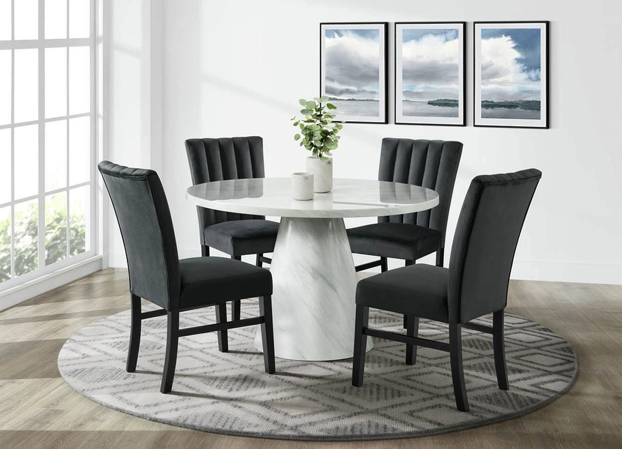- Default Set Includes1 x Bellini Round Dining Table (White) 4 x Bellini Velvet Side Chair (Black) 4 x Bellini Velvet Side Chair (Emerald) 4 x Bellini Velvet Side Chair (Grey) 4 x Bellini Velvet Side Chair (Navy Blue) 4 x Bellini Velvet Side Chair (Pink)