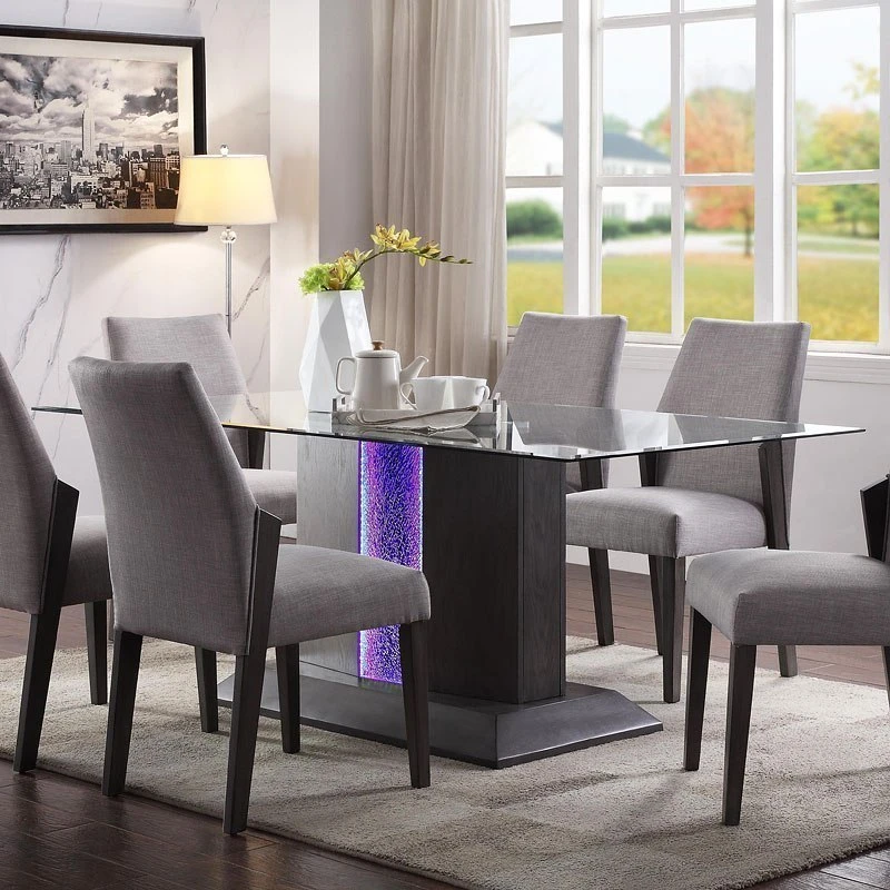 - OverviewThe Benoit Dining Room Collection by Acme Furniture is a place for family togetherness and conversation, making the dining area a must-have for every home. A traditional height dining table that comfortably seats six, the rectangular table adds upscale glamour bringing a chic, industrial feel to your dining area, featuring a sturdy base with LED lighted inlay.