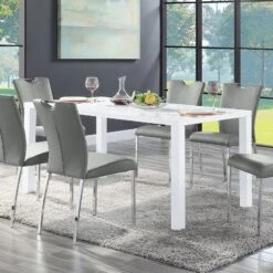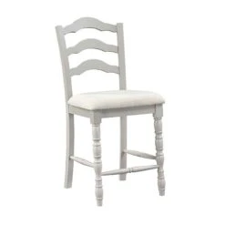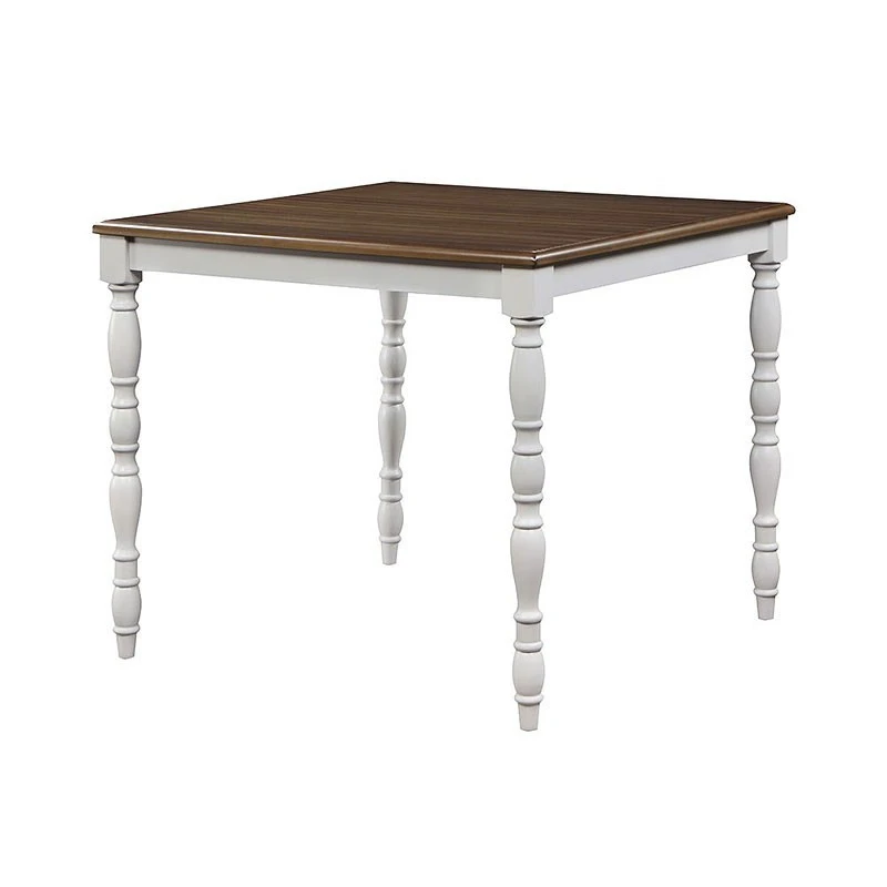 - OverviewThe Bettina 5-Piece Counter Height Dining Set by Acme Furniture is a great way to lighten up your dining room or breakfast nook while remaining true to a traditional aesthetic. This set is made up of select woods and veneers for an updated rustic look. The table and chairs are beautifully finished in an antique white and weathered oak for the perfect contrast. The matching padded chairs feature comfortable seats that are upholstered in beige fabric, slatted backrests, and turned legs that add visual appeal. This set will suit your dining needs.