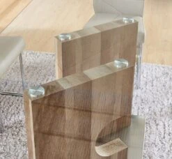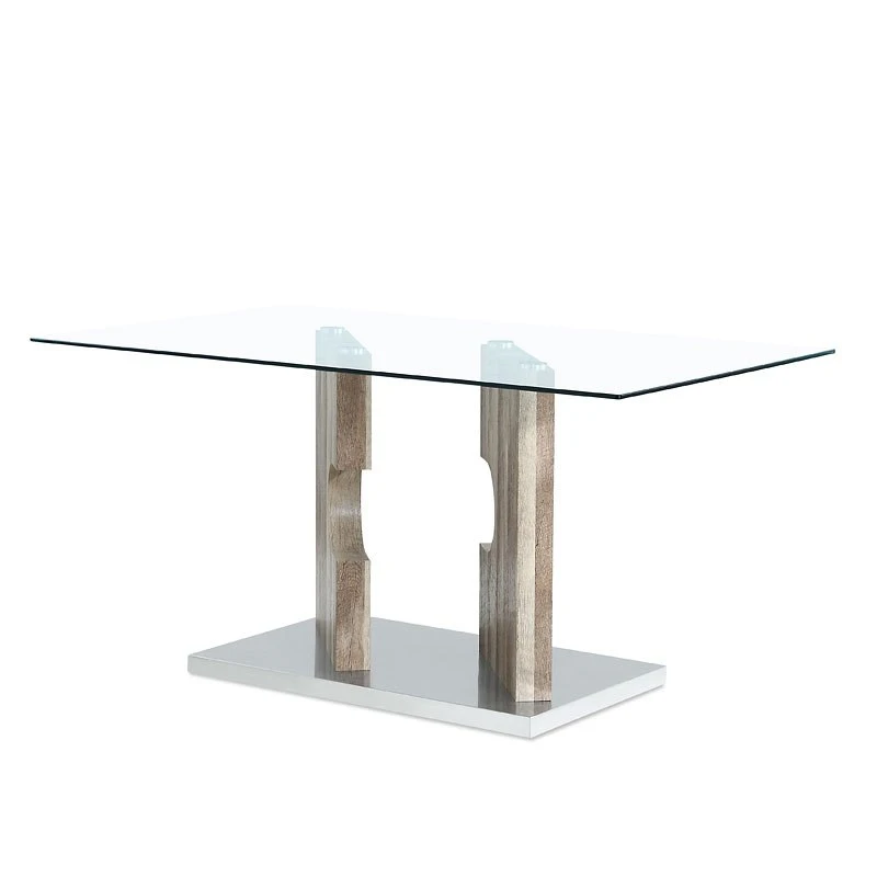 - OverviewThe D219 modern transitional styled double pedestal dining table by Global Furniture featuring clear glass top, cut out designed light brown driftwood tone pedestals and stainless steel base.
