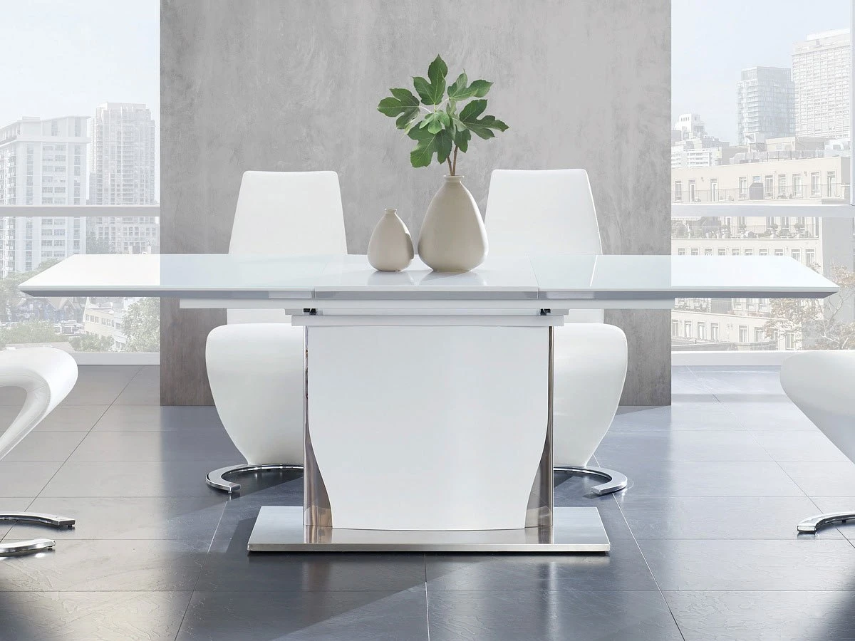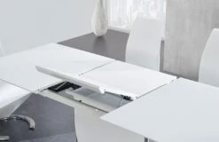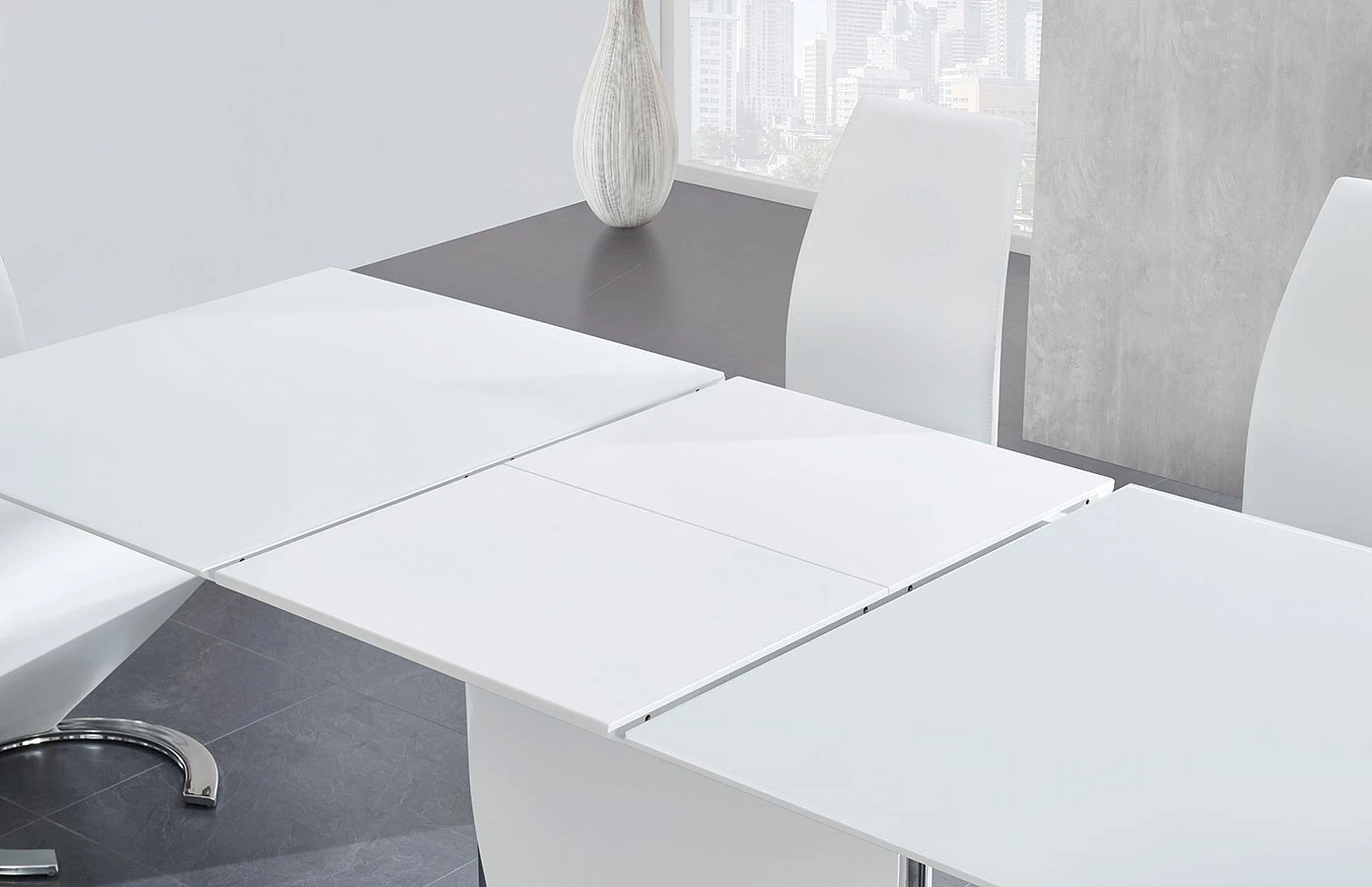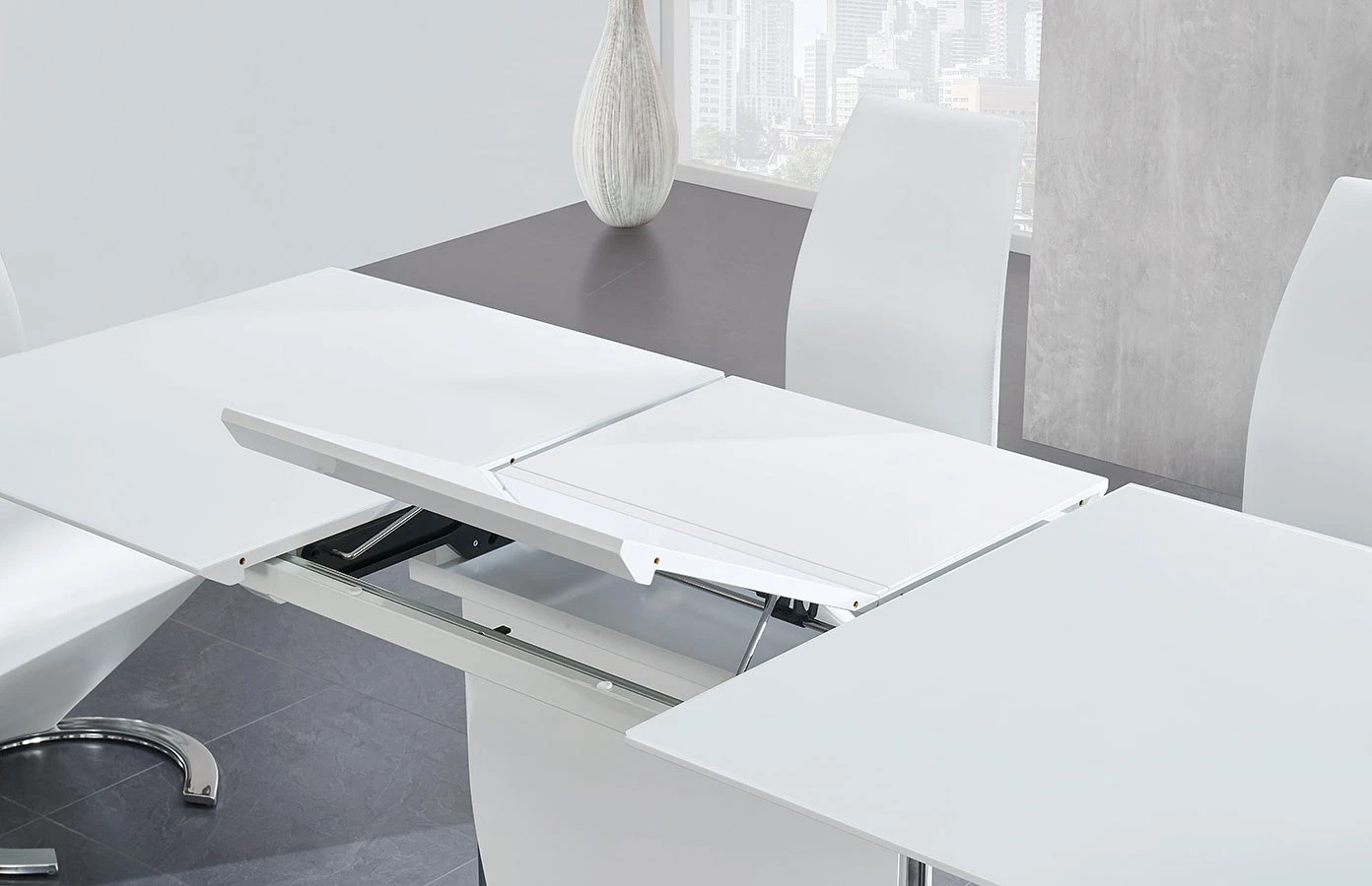 - OverviewEnjoy cutting-edge and minimalist style that’s as eye-catching as it is practical for your contemporary dining space. A high gloss white finish with brushed stainless steel accents is sleek and on-trend. The glass top over white high gloss wood extends from 63″ to 87″ to accommodate all of your guests, and the self-storing butterfly leaf hides seamlessly just below the tabletop when not in use.
