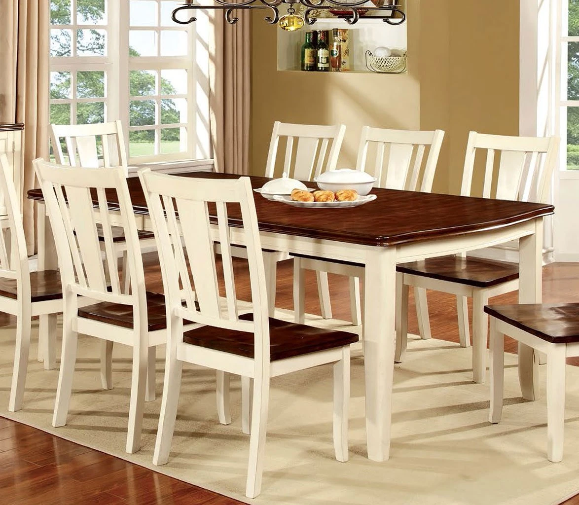 - OverviewThis gorgeous dining table from the Dover Dining Room Set (White) by Furniture of America features a rich cherry wood finish table top with 18-inch expandable leaf and moulded trim, resting upon sturdy vintage white tapered legs. The side chairs showcase contoured wood seats and slatted backs. The transitional style server is elegantly designed and can store all of your dish and glassware.