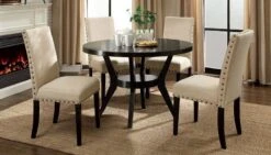 - OverviewThis Downtown Dining Room Set by Furniture of America provides a nice contrast with cream padded leatherette chairs against a deep espresso finish. Clean lines and simple design perfects this contemporary look.