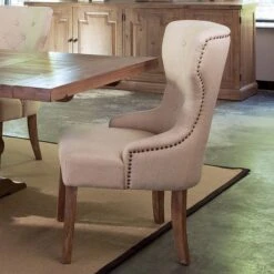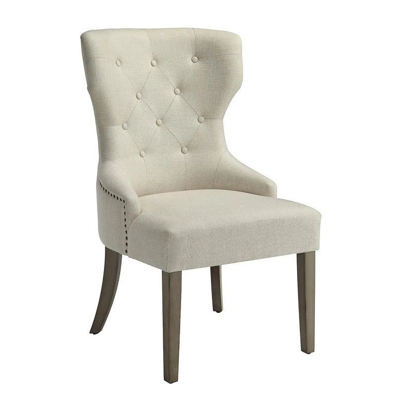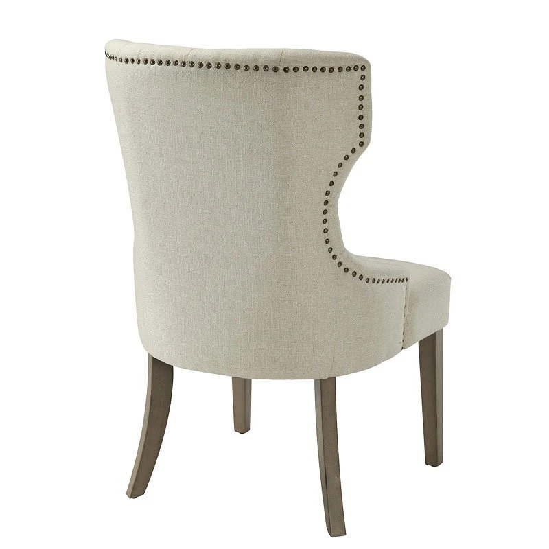 - OverviewThis modern shaped elegantly upholstered beige side chair is tufted with individually hand applied nailhead trim.