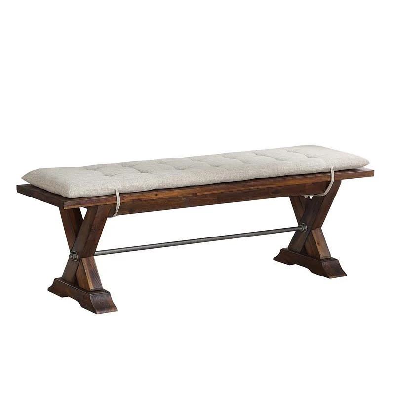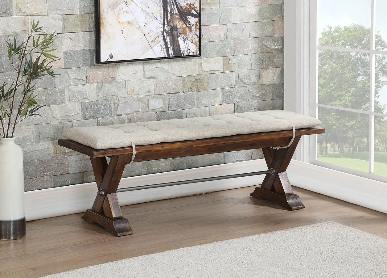Dining bench with “X” base and metal cross stretcher has tie on cushion in an easy care 100% polyester cover - DepartmentDining Benches