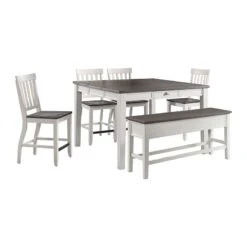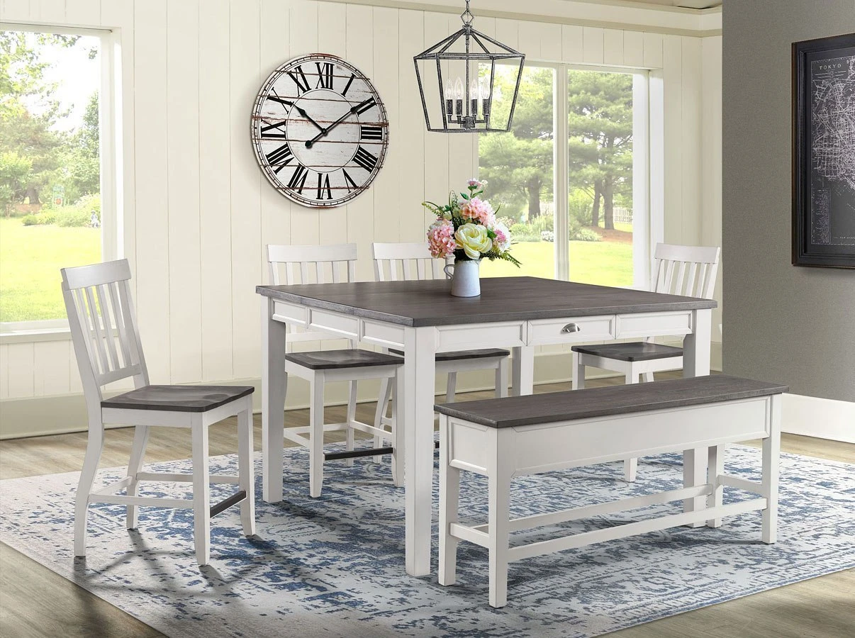 - OverviewUnique two-tone finish with a combination of Oak and Acacia substrates, the Two-Tone Kayla Dining Room Collection by Elements Furniture combines textured antique white color with trendy deconstructed styles for casual living. The weathered grey finish on top will make you feel right at home. This is the perfect table for a cozy dining nook.