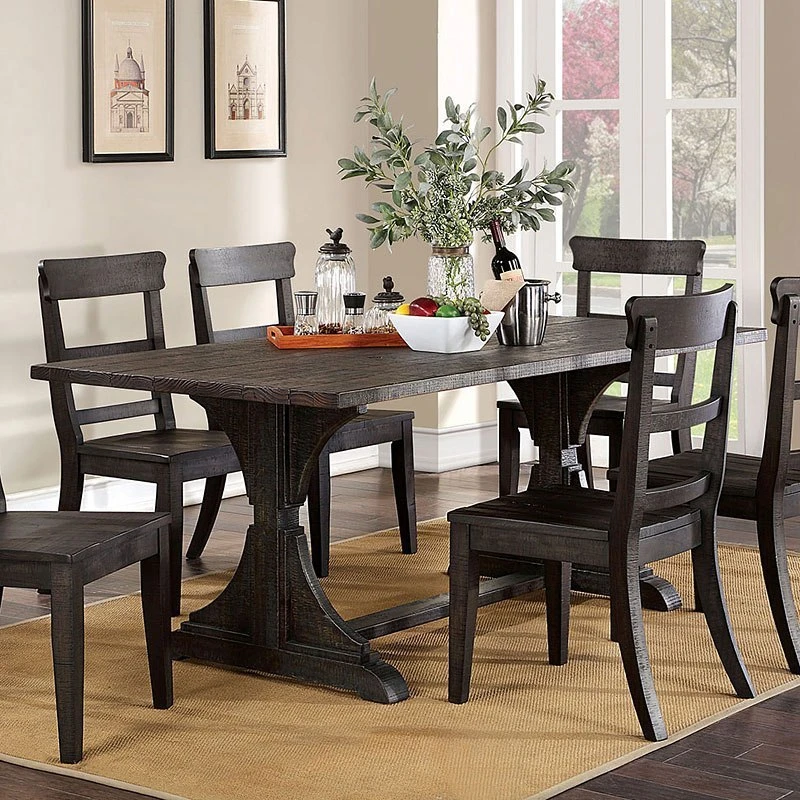- OverviewThis is a striking Leonidas dining table by Furniture of America for those looking for unique tone finishes. This antique black, upon closer inspection, reveals beautiful grain visible on the plank style table top. The trestle base has intricately carved designs. Made of pine and rubber wood, this solid ensemble redefines the dining hall color palette.