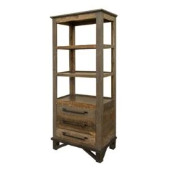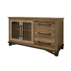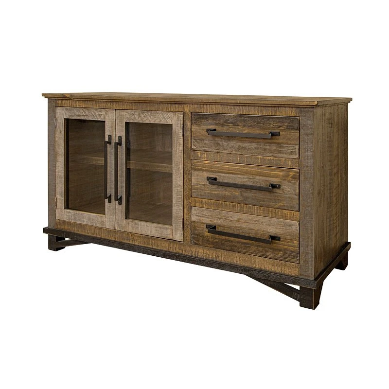 Features three deep drawers, two sliding doors that reveal storage with a fixed shelf and two extra storage compartments behind metal mesh doors on sides