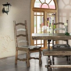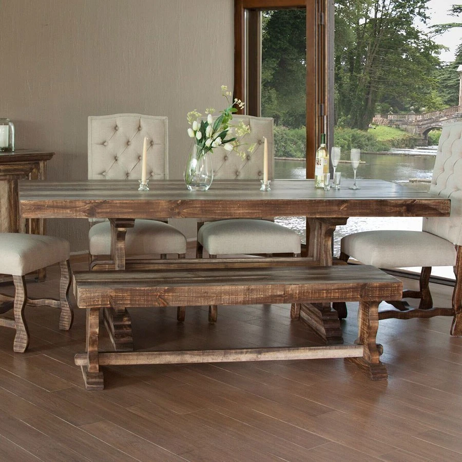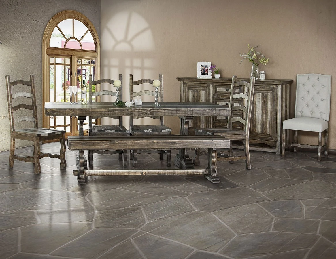 - OverviewFeaturing solid pine, this stunning Marquez Dining Room Set from the Marquez Collection by International Furniture Direct will surely impress your guests. Each piece is made to replicate antique/reclaimed wood parts and pieces, which means each item is unique. To provide this look, cracks, knots, knot-holes, splits and uneven rubbed edges are purposely left intact from original pieces of wood and in many instances additional man-made distressing is given to emphasize its rustic charm. These are not product defects but unique features that add beauty and character. Accordingly, expansion or shrinkage, small cracks and wood imperfection are inherent qualities of our product. Variation is what makes each piece unique, natural and exclusive.