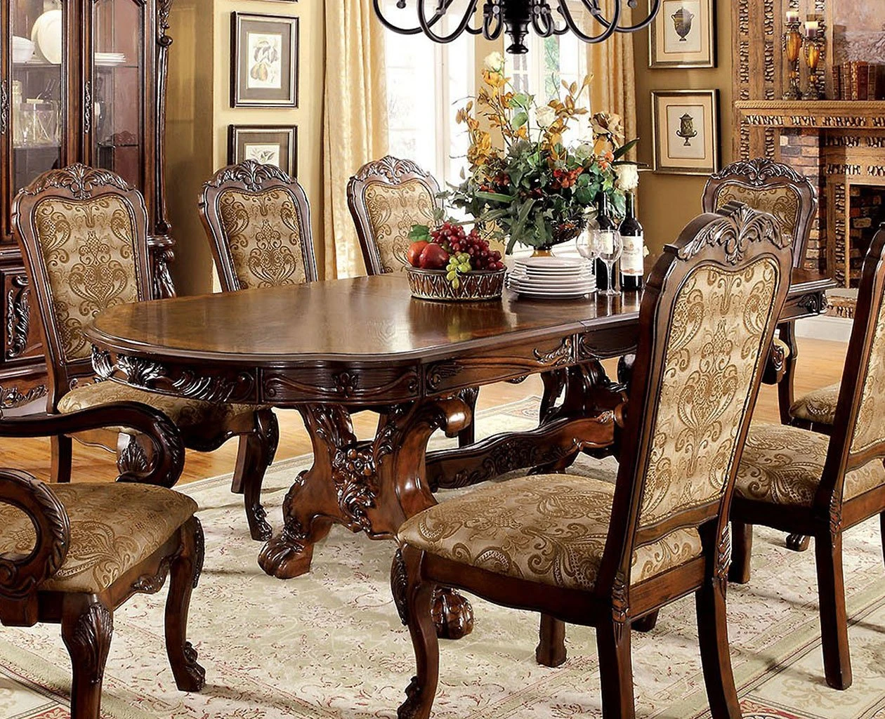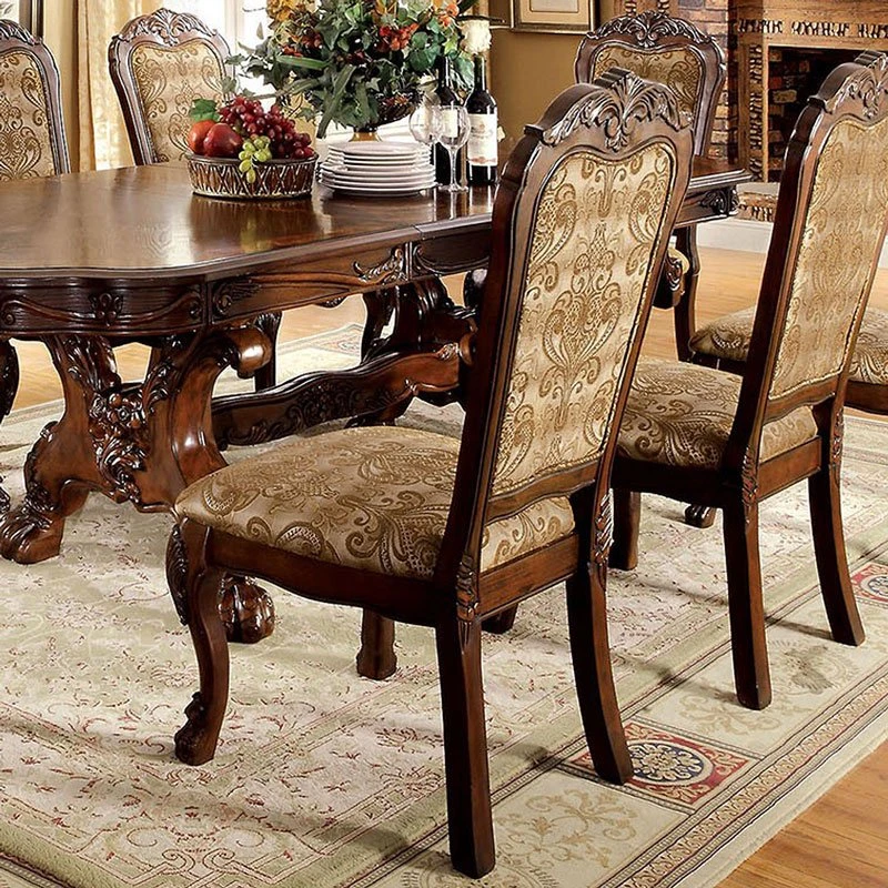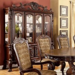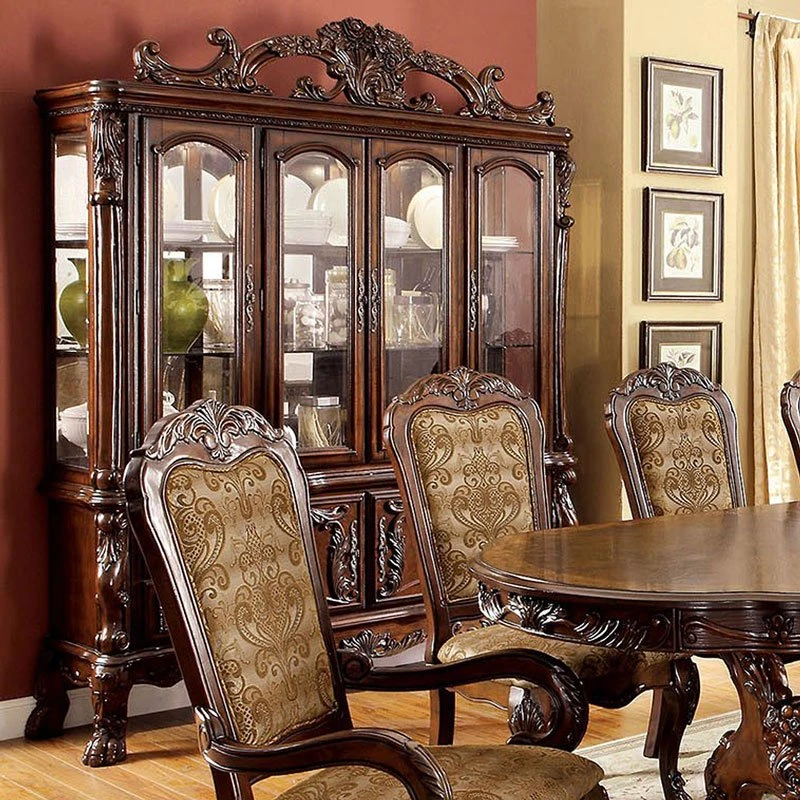 - OverviewThe dining room is a very important place in your home. It is where the family gathers and great conversations happen. It deserves something grand like this Medieve Dining Room Set (Cherry) by Furniture of America. The table features two expandable leaves, intricate apron details and lion claw feet. The chairs feature fabric padded seats with beautiful pattern and cabriole legs. Finished in cherry, a matching buffet with hutch completes this gorgeous set.