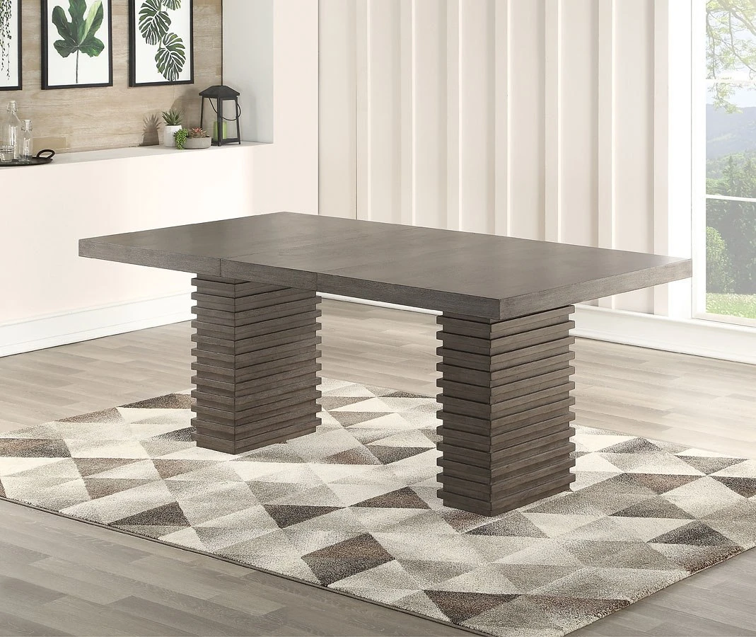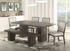 - OverviewEntertain your family and friends with the bold contemporary styling of Mila Dining Room Collection by Steve Silver Furniture. A fashion-forward washed grey finish over hardwood solids and ash veneers pairs beautifully with the modern trestle table and beige polyester back side chair.