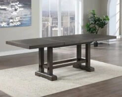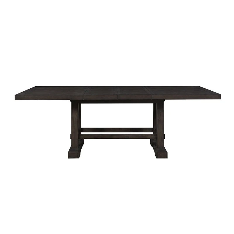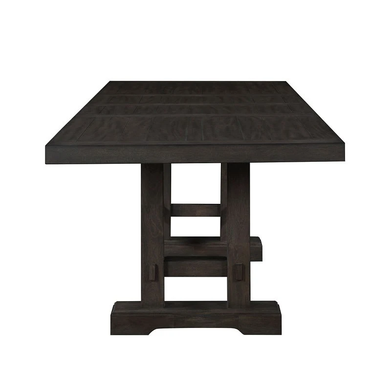 Styling details include plank-effect top, double pedestal base with exposed tenons