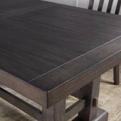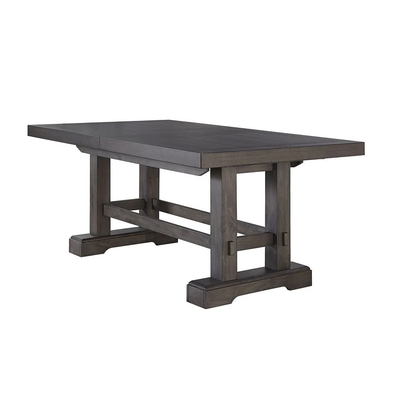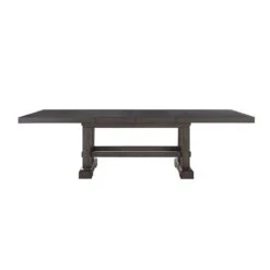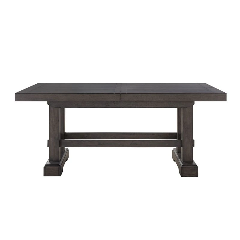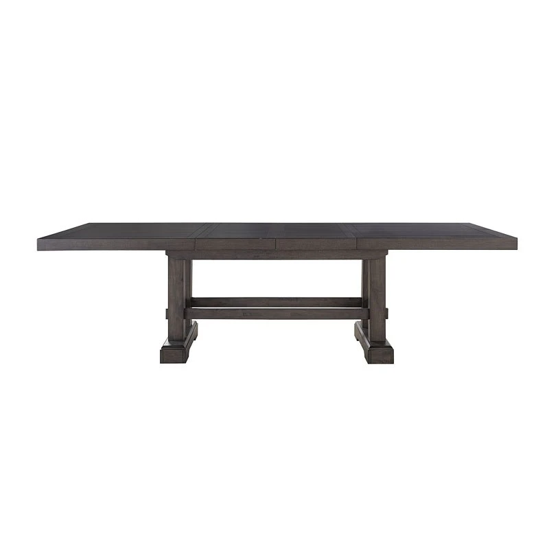 Styling details include plank-effect top, double pedestal base with exposed tenons