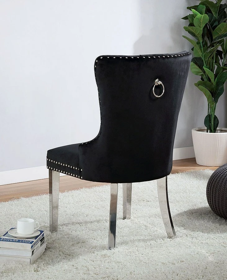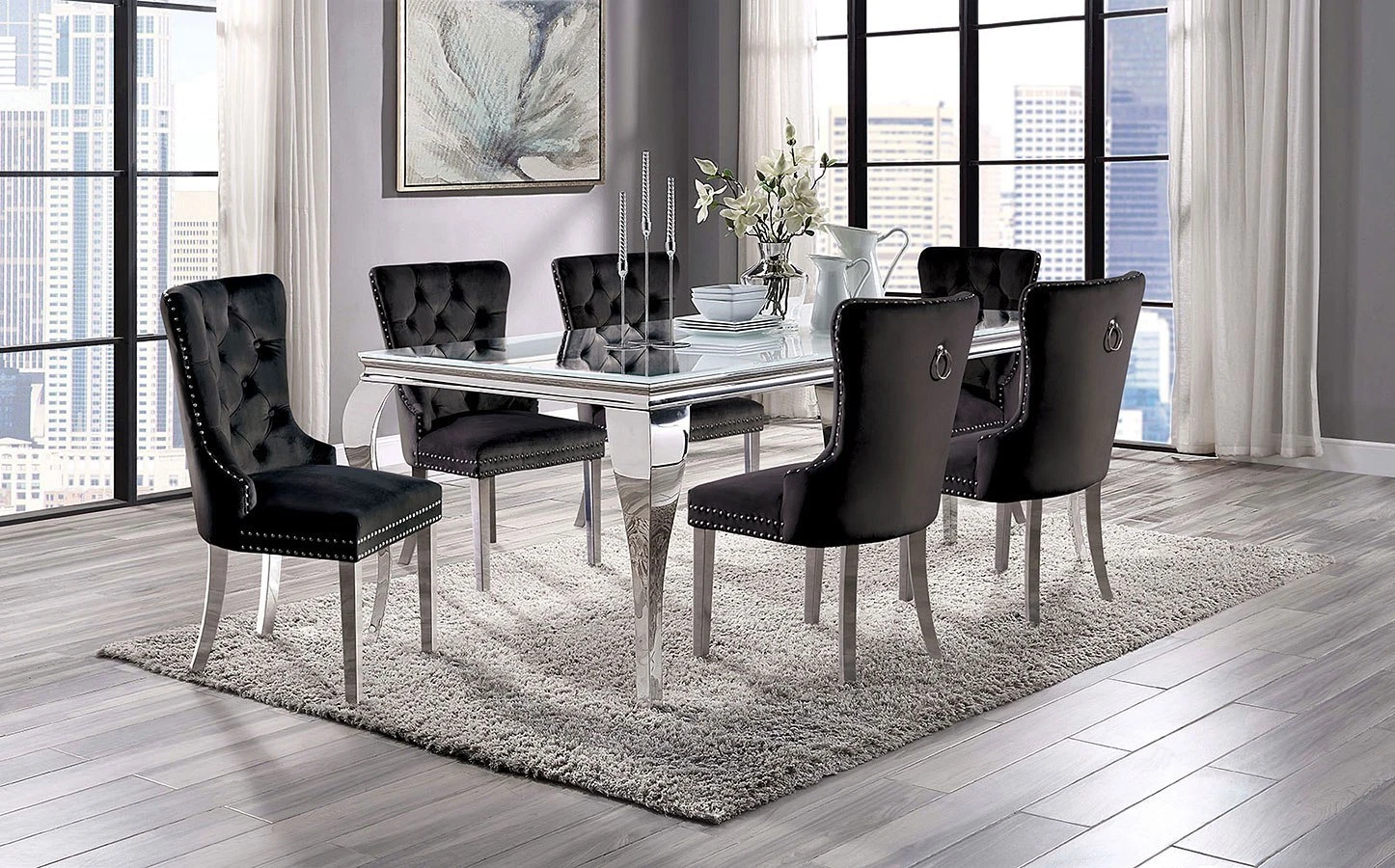 - OverviewAdd not-so-subtle sophistication to your dining room with this bold Neuveville Dining Room Collection by Furniture of America. The cabriole legs are definitely the eye-catching feature – each corner with curves reminiscent of classic pieces – only with the infusion of some contemporary flair in their bright chrome finish. Don’t forget the beveled table top made of faux marble, durable and just as stunning. Combined with these elegant, button-tufted wingback chairs, it’s a glam piece waiting to be part of your Hollywood dream home.
