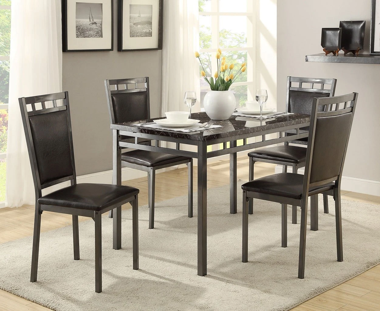 - OverviewDesigned for your modest dining space, the Olney 5-Piece Dinette Set by Homelegance provides a stylish and functional surface for your mealtime needs. In this five-piece packed offering, the metal table base rises to support the faux marble fixed table top. Vertical accents grace the table apron and the top rails of the dark brown bi-cast vinyl covered chairs.