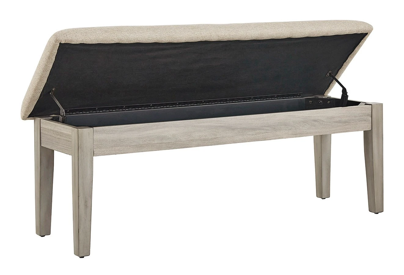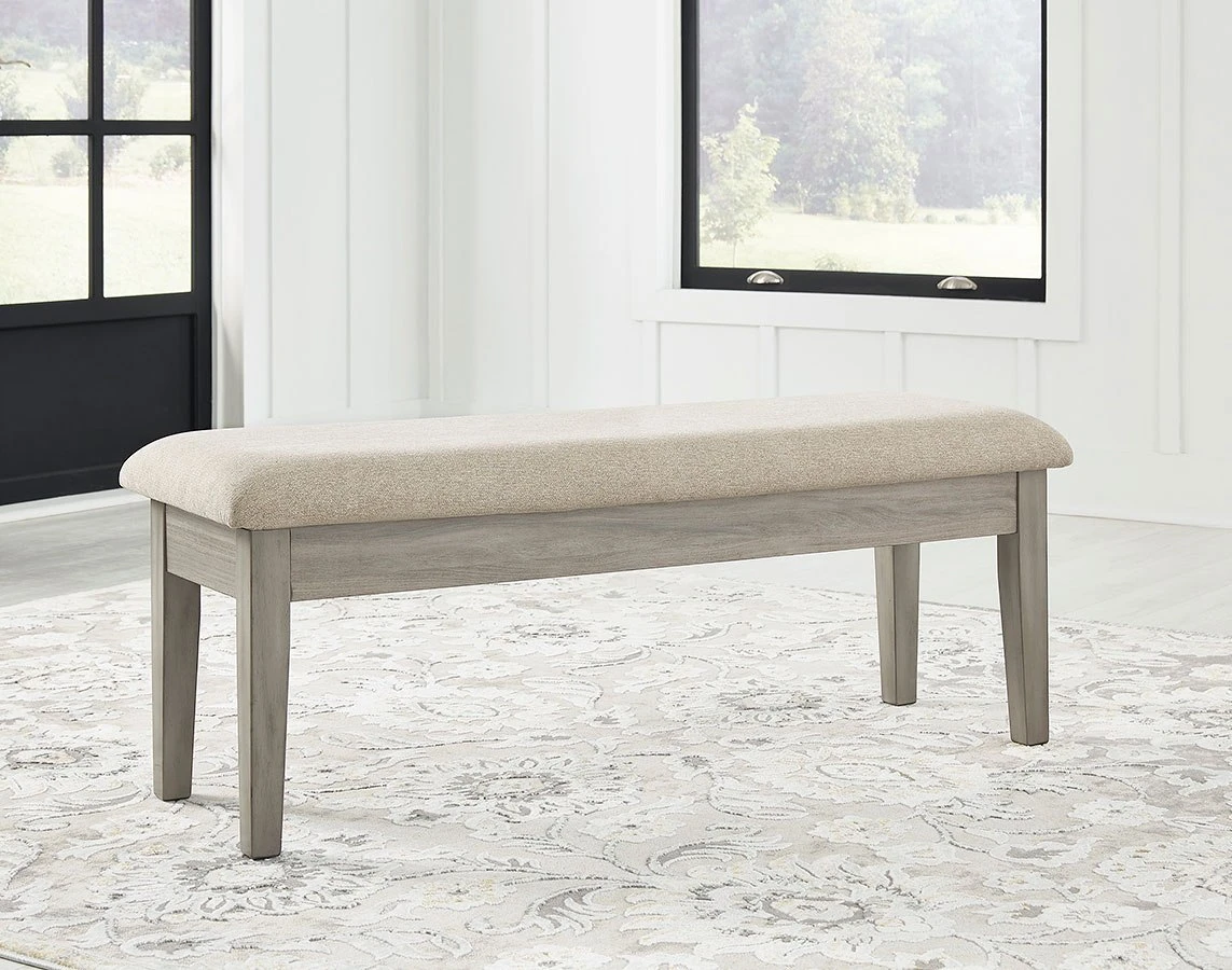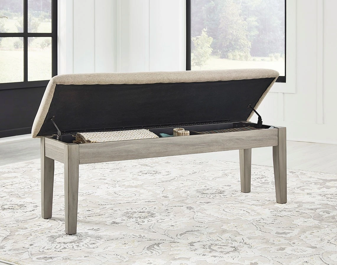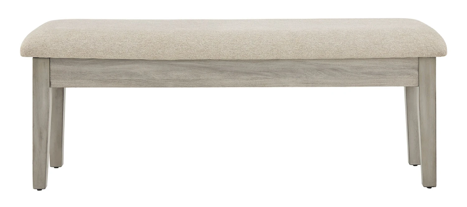 - OverviewBring a relaxed-yet-refined sense of good taste to a space with this wonderfully comfortable Parellen upholstered dining bench. An inspired choice for modern farmhouse living, its clean-lined frame sports a gray finish that’s so easy on the eyes. The bench’s cushioned upholstered seat, covered in a complementary textured beige fabric, goes easy on the body. Tuck your treasures out of sight with hidden storage under the seat.