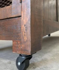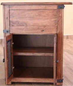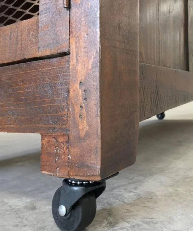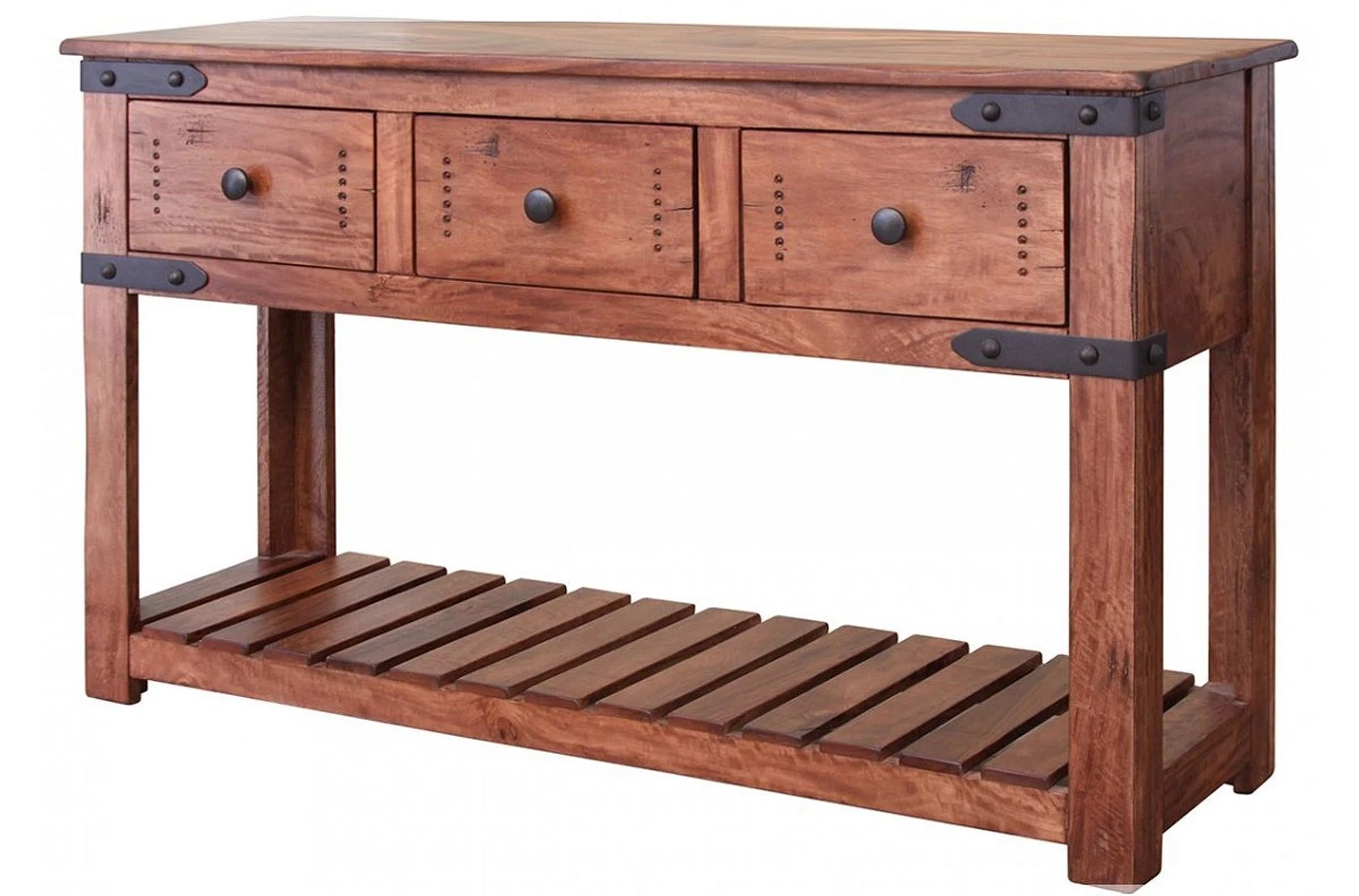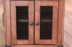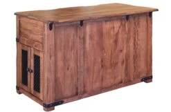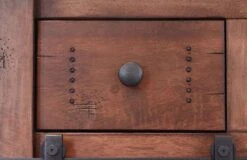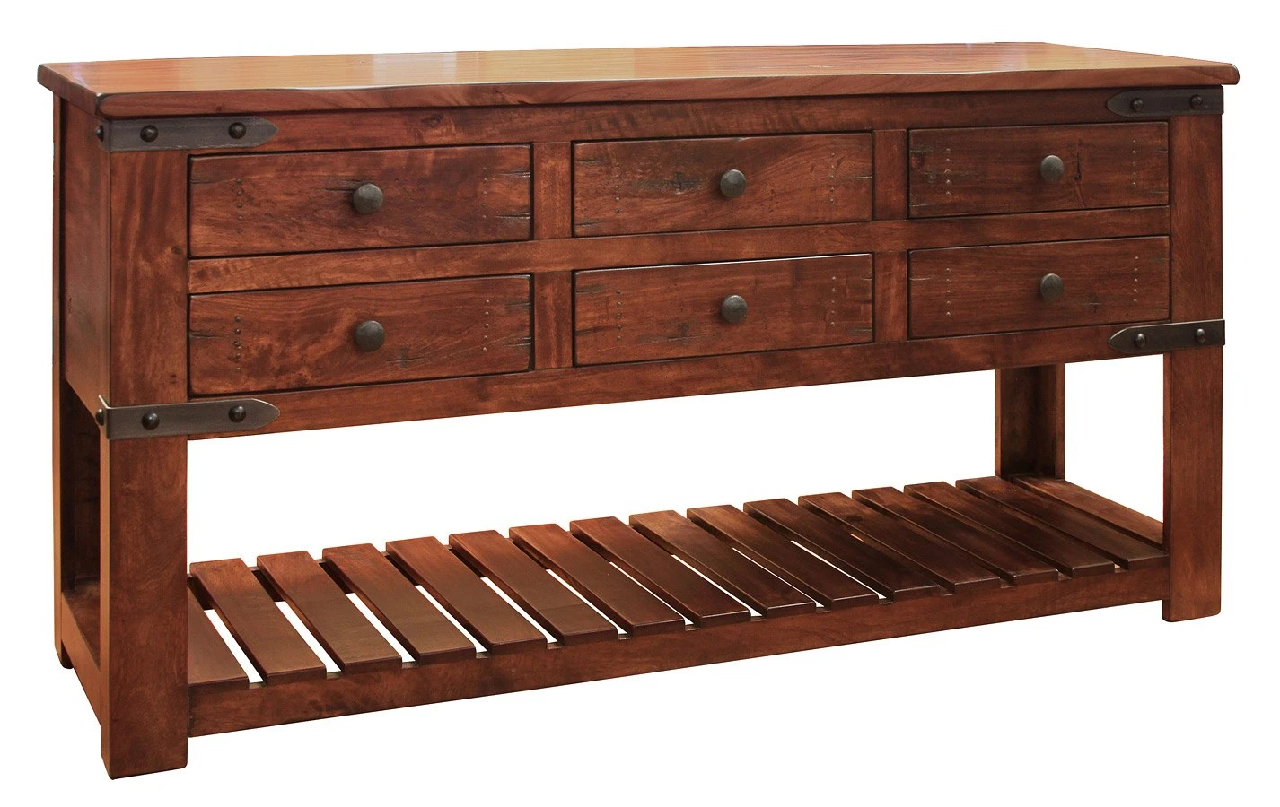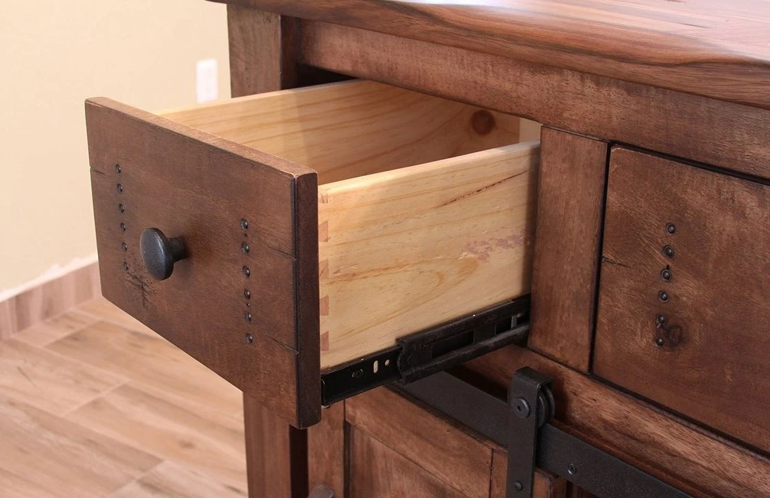 Drawer fronts include hand inserted rust finish nails and cast iron pulls, adding authentic rustic appeal