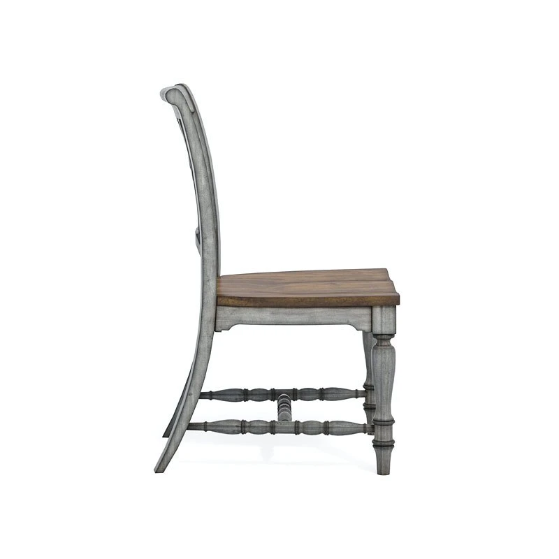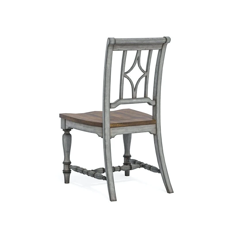 - OverviewAdd cozy charm to mealtimes with the Plymouth Dining Chair by Flexsteel, designed to complement our Plymouth dining tables with a coordinating cottage look. Featuring an appealing open-back design with a diamond-shaped detail, intricately carved trestles, and turned legs, this chair provides a vintage look that’s full of character. With its weathered graywash finish and contrasting medium brown seat, this chair can be easily mixed and matched with other Plymouth chairs in the collection for a cohesive look.
