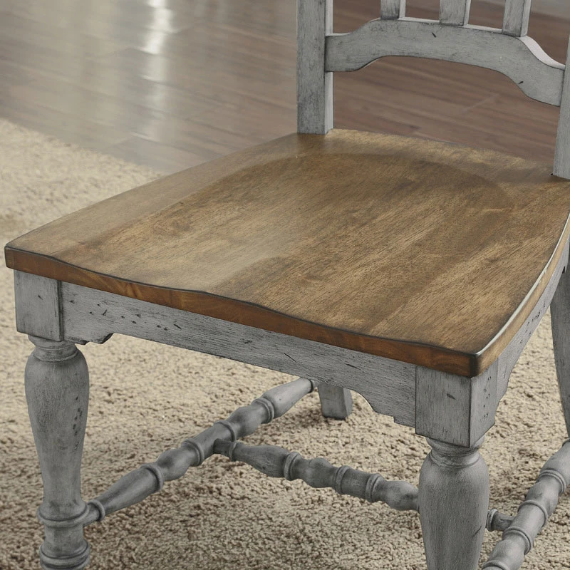 Distressed graywash finish with medium brown seat provide a well-worn and cozy aesthetic