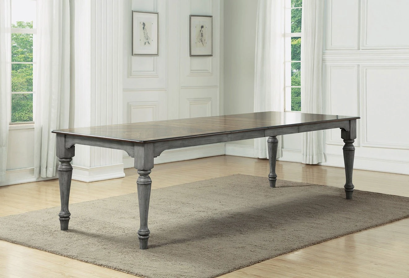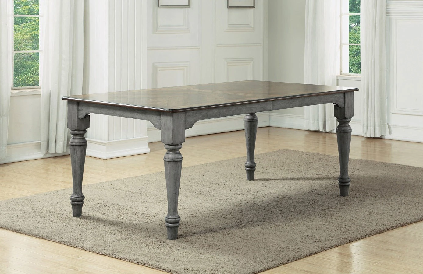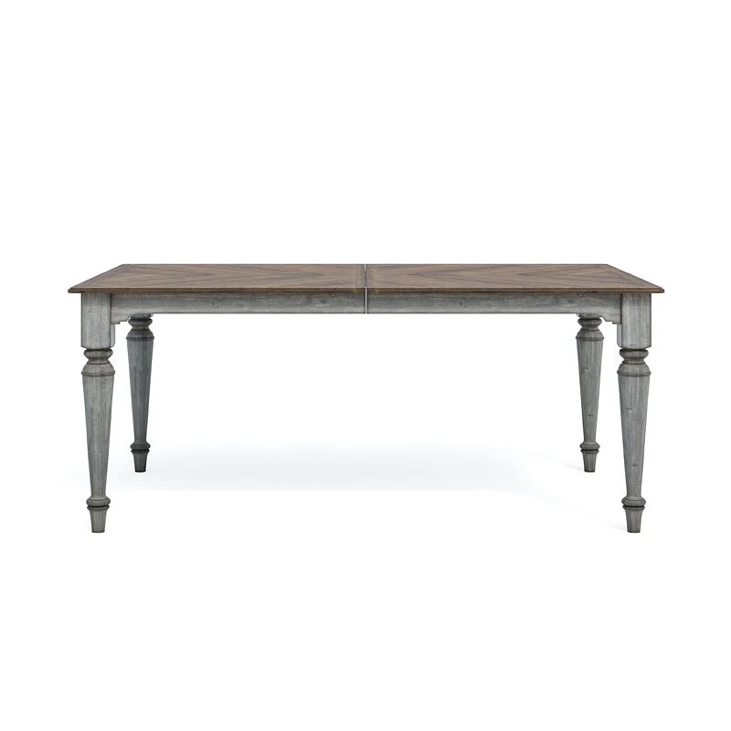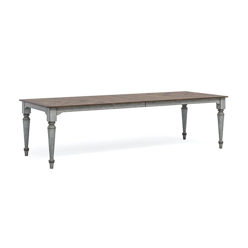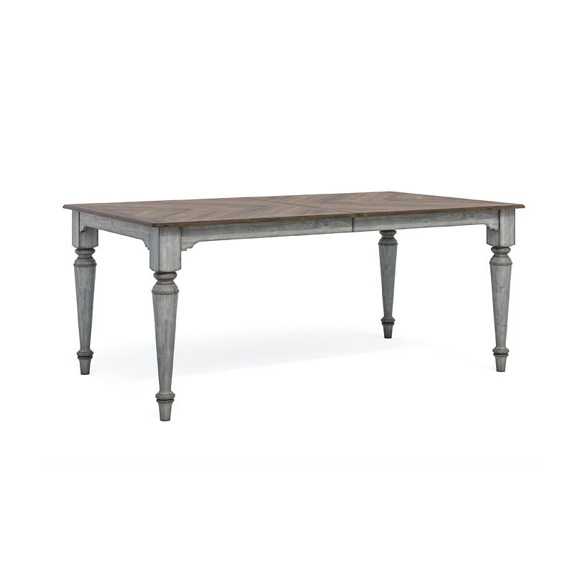 - OverviewDine and entertain in charming vintage style with the Plymouth Rectangular Dining Table by Flexsteel, featuring intricately turned legs for an appealing look. A distressed graywash finish contrasted with a medium brown top adds cottage-inspired character. Accommodate extra dining guests with two removable leaf inserts that increase tabletop space and then conveniently store away when not needed.