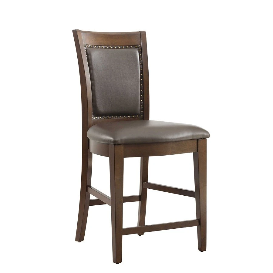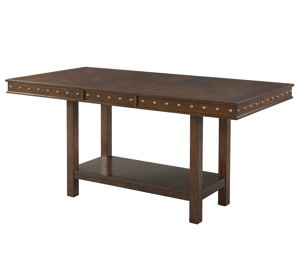 - OverviewGather for dinner in style with the rustic chic Prescott Collection by Elements Furniture. This charming set features a trestle table dressed in a rich mahogany finish adorned with bronze nail head trim. The matching chairs are covered in high fashion faux leather upholstery with stylish bronze nail head trim. This table features a removable leaf allowing you to easily adjust the length of the table as needed.