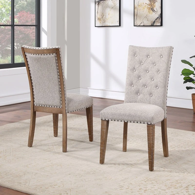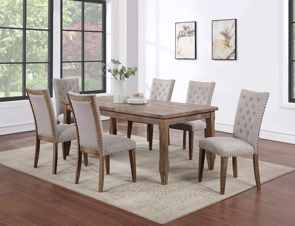 - OverviewCasual and relaxed, but with a subtle sophistication you’ll appreciate, Riverdale Dining Room Collection by Steve Silver Furniture elevates Modern Ranch style with this upholstered dining set built for today’s lifestyles. The collection carries on the Riverdale of heirloom distressing and waxy finish hang-up but adds a new twist by pairing the table with a button-tufted, nail-head trim chair that dresses up the collection just enough to make your meals ever more delightful.