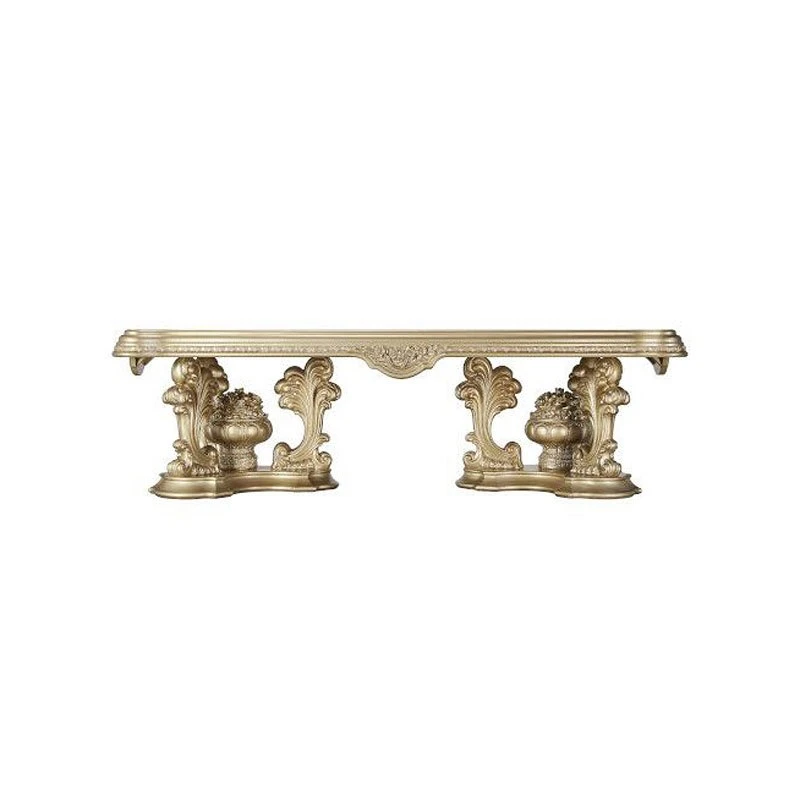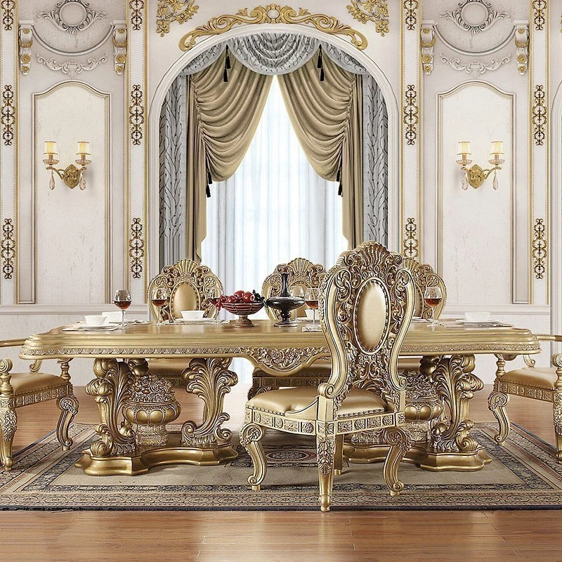 - OverviewThere is nothing more sophisticated and luxurious than the Seville Dining Room Collection by Acme Furniture that makes anyone catch their breath at first glance. Luxuriously carved ornaments and lustrous gold finishes on the wooden frame set the room’s opulent tone. The double pedestal base bestows a classic silhouette on the rectangular dining table, while the dining chairs are beautifully designed with gentle curves and padded seats. Matching curio and server help you create a practical, stylish, and organized space. Indulge in lavish comfort with the Seville Dining Room Collection.