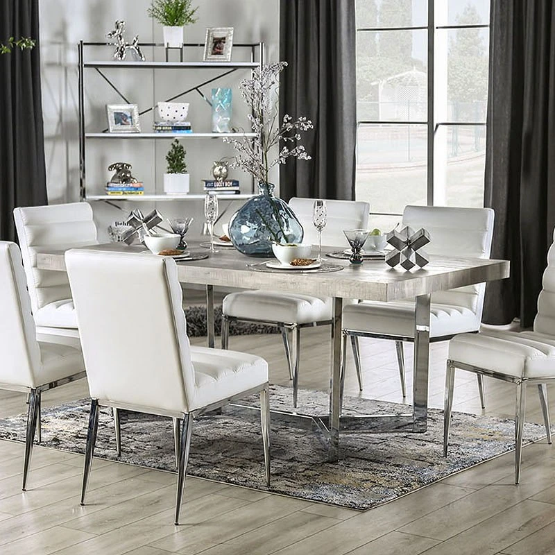 - OverviewUniquely designed closed chrome metal legs highlight this rectangular Sindy Dining Table by Furniture of America with the gorgeous table top. When you want something that’s a bit out of the norm, this piece fits the bill and is a wonderful addition to any room.