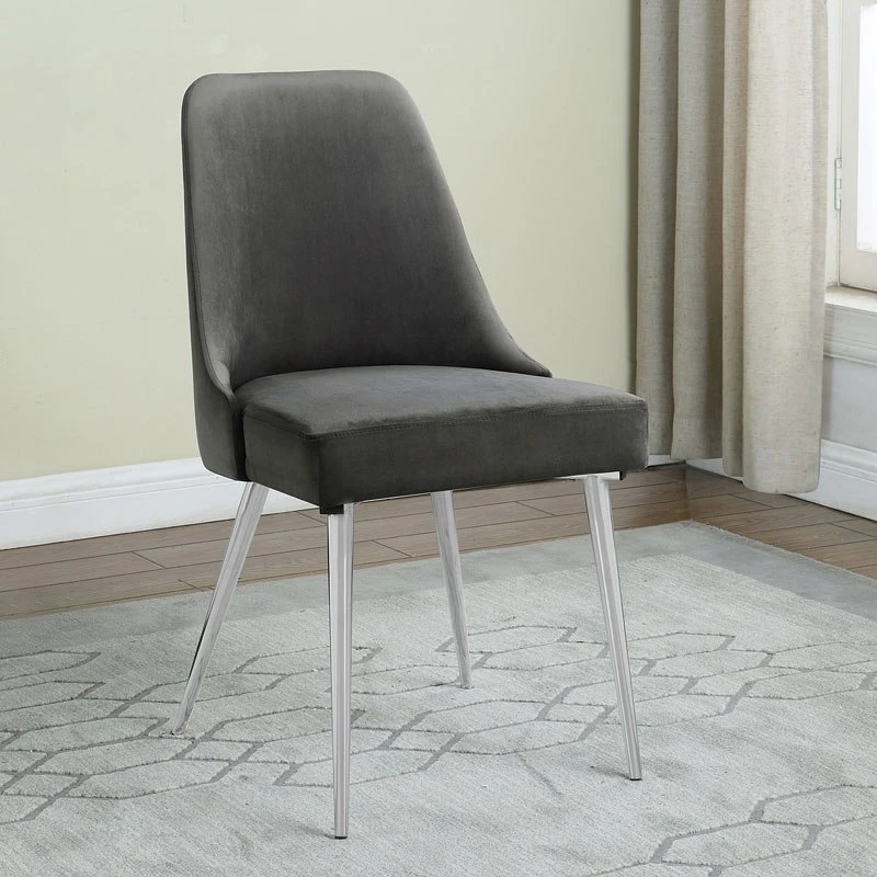- OverviewToday’s modern homes require clean line designs accented with a bit of curve like this Sonnett Dining Room Collection by Coaster Furniture. The curved back chair in a matte grey-loden velvet has tapered, chrome metal legs.