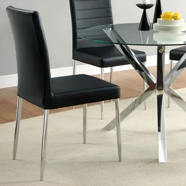 - OverviewCool style to refresh any home, the clean lines and modern look of the Vance Dining Room Collection by Coaster Furniture feature a bold chrome leg base and a clear, round tempered-glass top. The matching black chairs feature a shiny chrome finish on the trim chairs legs for a sleek style in your kitchen or dining room.