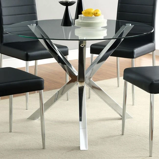- OverviewCool style to refresh any home, the clean lines and modern look of the Vance Dining Room Collection by Coaster Furniture feature a bold chrome leg base and a clear, round tempered-glass top. The matching black chairs feature a shiny chrome finish on the trim chairs legs for a sleek style in your kitchen or dining room.