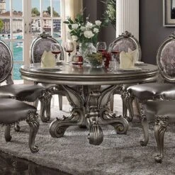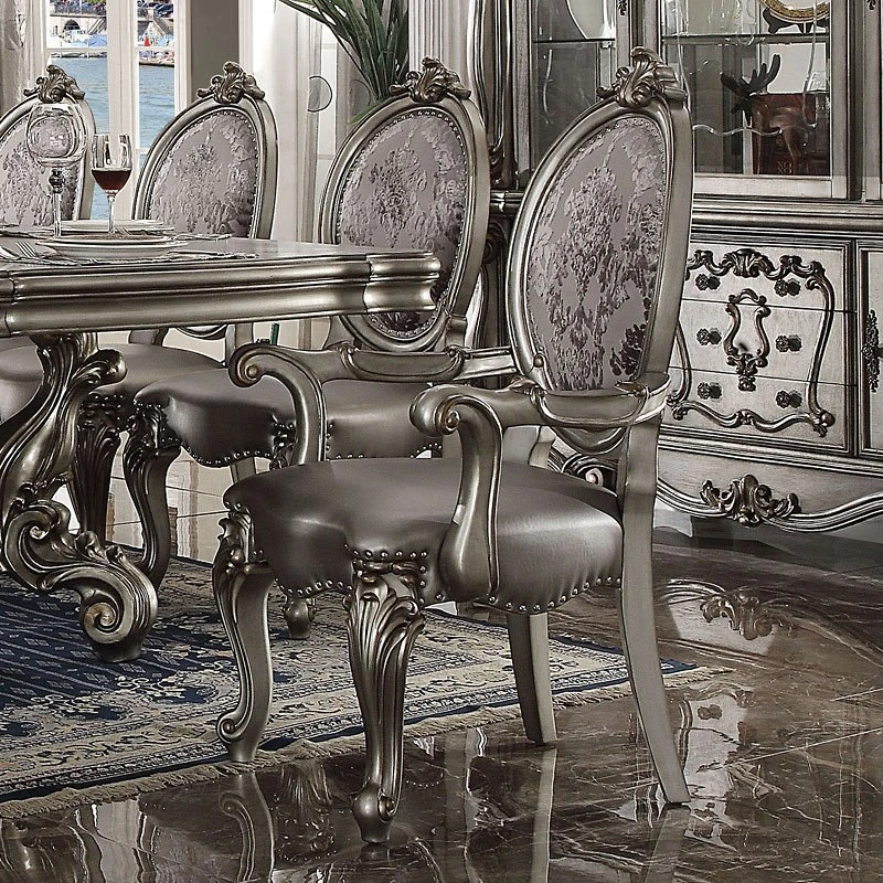 - Default Set Includes1 x Versailles Round Dining Table (Antique Platinum) 4 x Versailles Side Chair (Antique Platinum) 4 x Versailles Arm Chair (Antique Platinum)
