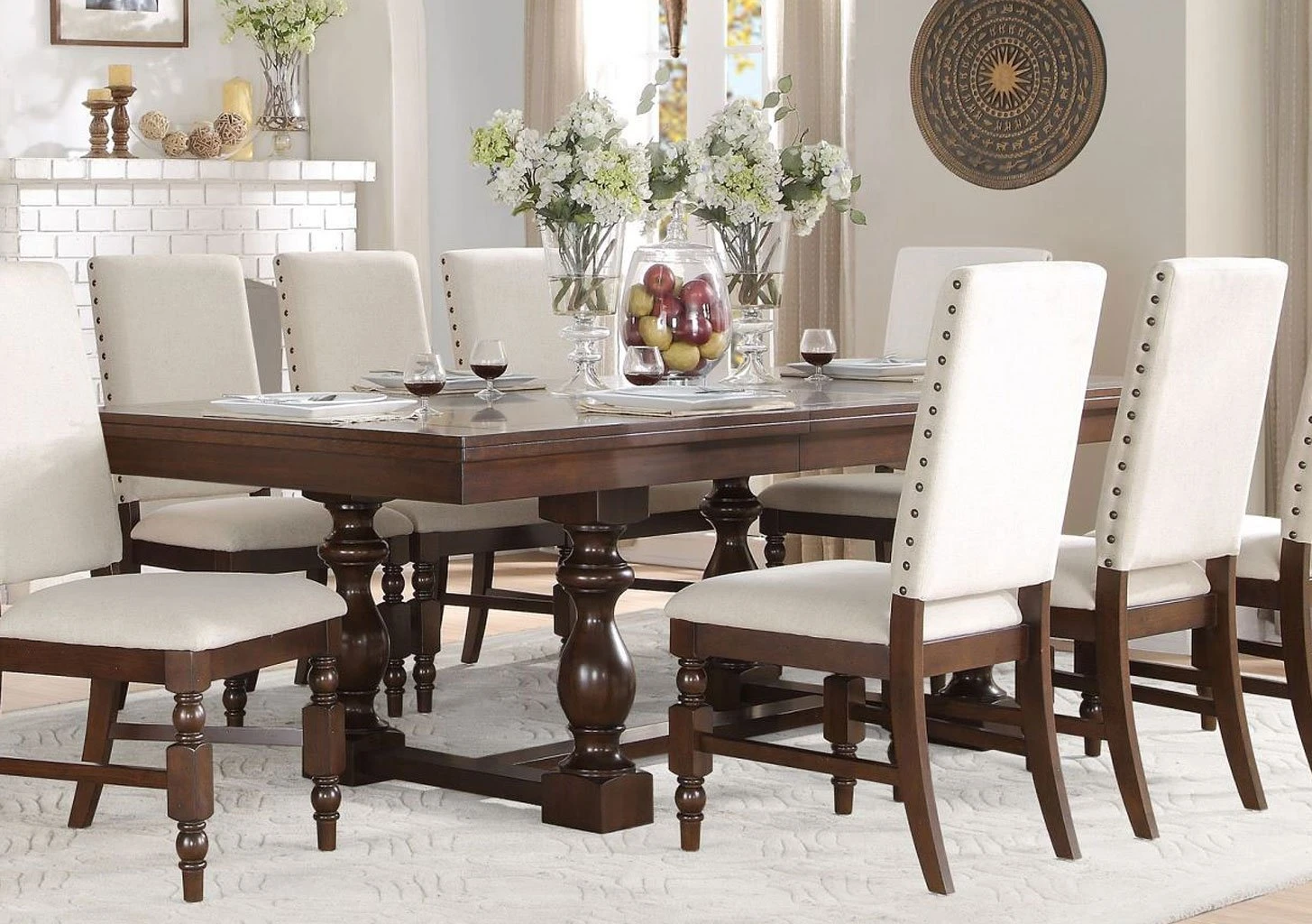 - OverviewBlending the look of country style with the popular modern industrial aesthetic, the Yates Dining Room Collection by Homelegance manages to achieve a look that is unique unto itself. The turned legs of the trestle base rise to support the burnished dark oak table top.