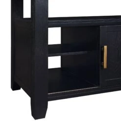 Three storage cubbies underneath the shelf- one open, two covered with sliding doors on each side